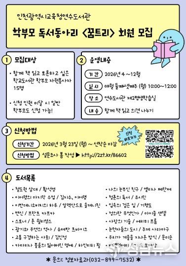 인천광역시교육청연수도서관은 학부모의 자발적인 독서 활동을 장려하기 위하여 오는 12월까지 학부모 독서동아리 ‘꿈트리’를 운영한다고 밝혔다.