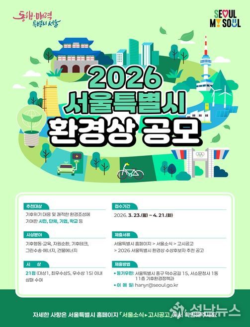 '2026년 서울특별시 환경상'은 기후행동·교육, 자원순환, 기후테크, 그린수송·에너지, 건물에너지 총 5개 분야에서 대상 1명, 최우수상 5명, 우수상 15명 등 총 21명(시민, 단체, 기업)을 선정해 시상할 계획이다.