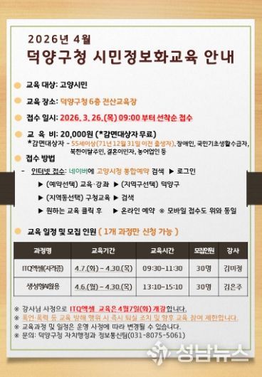 교육은 4월 6일부터 30일까지 덕양구청 전산 교육장에서 진행되며, 수강 신청은 3월 26일 목요일 오전 9시부터 덕양구청 통합예약 누리집을 통해 온라인으로 접수할 수 있다.