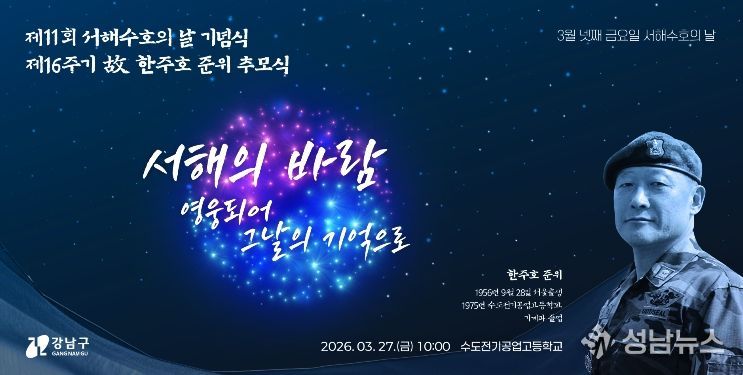 꿈이 모이는 도시, 미래를 그리는 강남구가 3월 27일 수도전기공업고등학교에서 ‘제11회 서해수호의 날 기념식’과 ‘제16주기 故 한주호 준위 추모식’을 연다. 주민, 학생, 보훈단체, 군 관계자 등 500여 명이 함께할 예정이다.