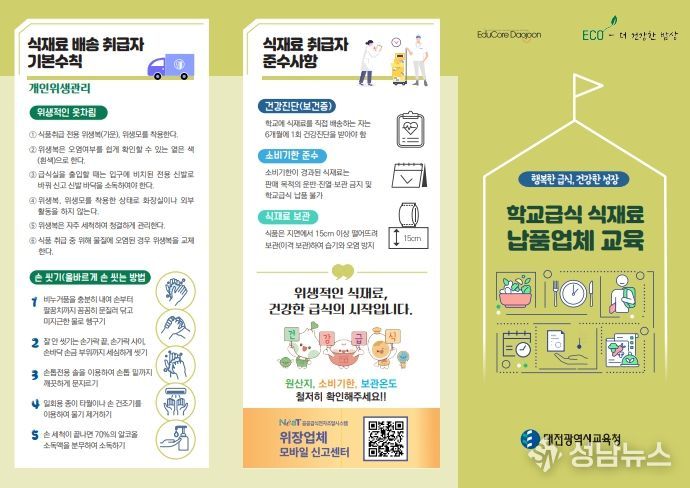 대전시교육청은 안전하고 건강한 학교급식을 위해 학교급식 식재료 공급업체를 대상으로 교육 리플릿을 제작·배부했다고 밝혔다.
