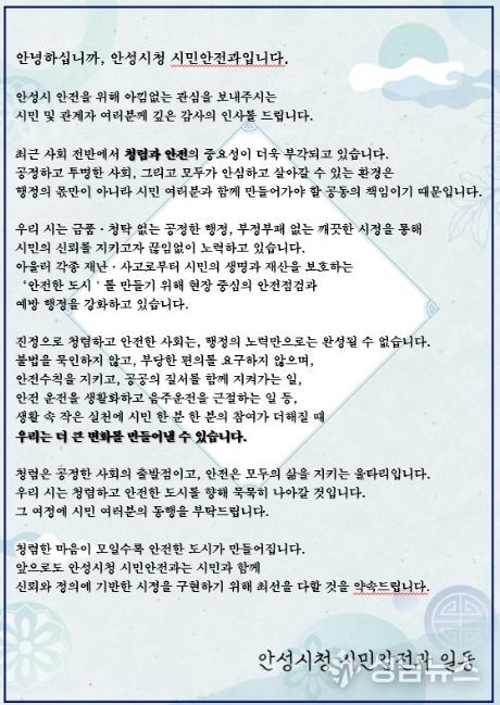 안성시는 각종 안전점검 과정에서 청렴 안내문을 배부하는 ‘청렴한 안전점검’을 추진하며 시민 청렴의식 제고에 나선다.
