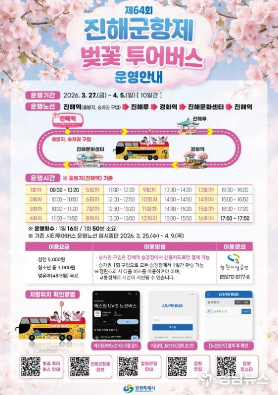 창원특례시는 오는 3월 27일부터 4월 5일까지 열흘간 제64회 진해군항제와 연계한 ‘벚꽃 투어버스’ 특별 노선을 운영한다.