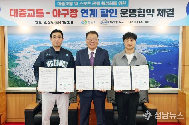 창원특례시와 NC 다이노스, ㈜마이비는 24일 창원시청에서 시내버스-야구장 연계 할인 서비스 제공을 위한 업무협약을 체결했다.