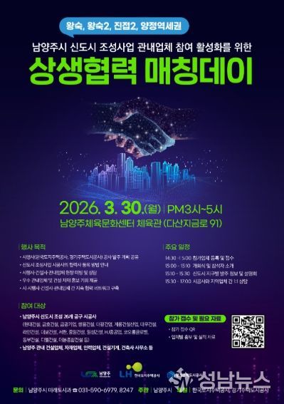 시 관계자는 “이번 자리를 통해 시행사·건설사와 관내 기업이 서로를 신뢰할 수 있는 파트너로 인식하는 자리가 되길 바란다”며 “남양주가 성장하는 만큼 우리 지역 기업도 함께 성장할 수 있도록 행정적 가교 역할을 끝까지 수행하겠다”고 전했다.
