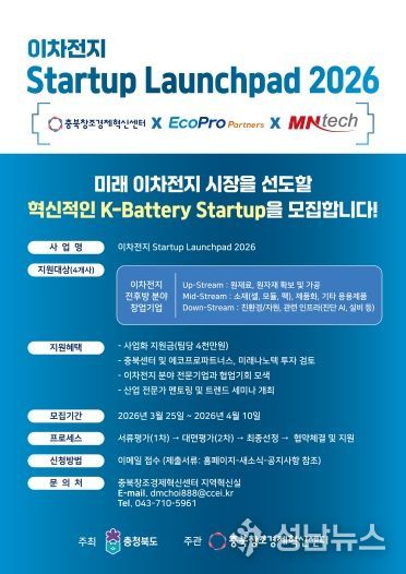 충북도가 이차전지 혁신 기술을 보유한 스타트업을 발굴해 육성하는 '이차전지 스타트업 육성 플랫폼 구축 지원사업(이차전지 Startup Launchpad 2026)' 참여 기업을 4월 10일까지 모집한다.