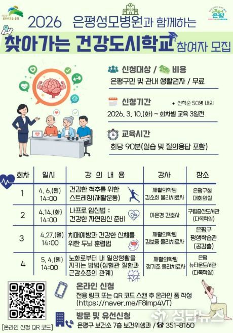 교육은 다음 달 6일부터 5월 4일까지 총 4회 운영되며, 은평구민과 관내 생활권자를 대상으로 회차별 50명 내외를 선착순 모집한다. 신청은 각 회차 교육 시작 3일 전까지 보건소 방문, 전화 또는 홍보물 큐알(QR)코드 접속을 통해 가능하다.