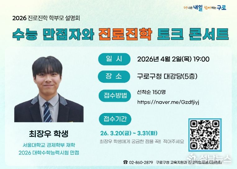 구로구가 오는 4월 2일 구로구청 대강당에서 ‘2026 수능 만점자와 진로진학 토크콘서트’를 개최한다.