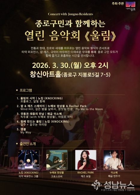 정문헌 구청장은 “봄의 시작과 함께 마련한 이번 공연이 구민 여러분에게 여유와 활력을 전하길 바란다”라며 “앞으로도 누구나 가까운 곳에서 문화예술을 누릴 수 있도록 다채로운 기회를 꾸준히 마련하겠다”고 밝혔다.