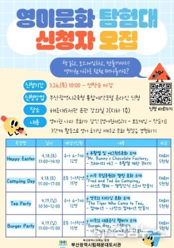 부산광역시립해운대도서관은 오는 4월 18일과 19일 해운대도서관에서 6~7세 유아와 1~3학년 초등학생 50여 명을 대상으로 영미문화 체험 특강 ‘영미문화 탐험대’를 운영한다.