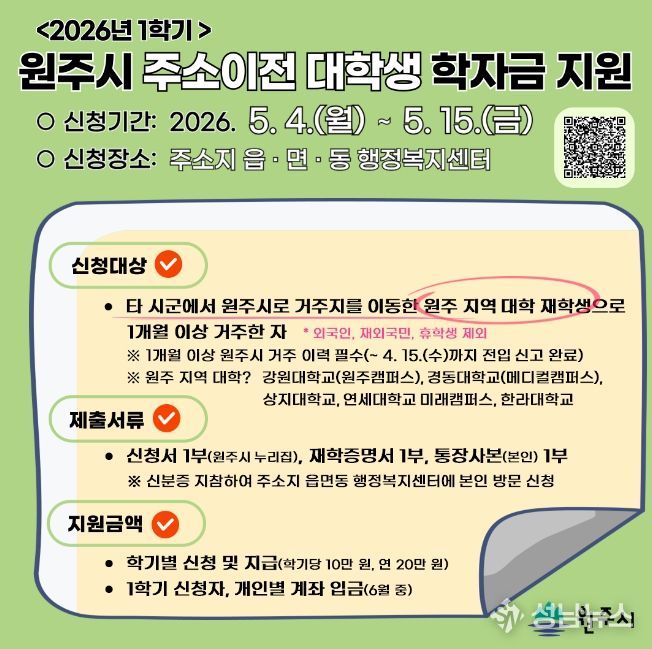 원주시는 전입신고를 마치고 원주시민이 된 대학생에게 상·하반기 각 10만 원씩 연간 20만 원의 학자금을 지원한다.