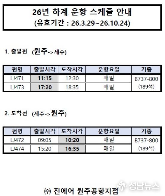3월 29일부터 원주공항에서 출발하는 제주행 항공편은 종전 오전 11시 10분·오후 4시 35분에서 오전 11시 15분·오후 5시 20분으로 변경되며, 제주에서 원주공항으로 돌아오는 항공편은 종전 오전 9시 5분·오후 2시 30분에서 오전 9시 5분·오후 3시 20분으로 조정된다.