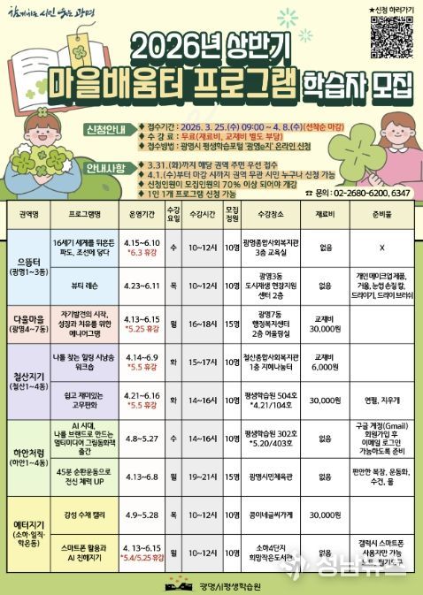 광명시가 시민들이 생활권 내에서 평생학습을 누릴 수 있도록 ‘2026년 상반기 권역별 마을배움터 프로그램’ 수강생을 오는 4월 8일까지 모집한다.