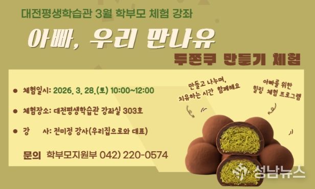 대전시교육청 평생학습관은 아버지 학부모의 적극적인 참여와 역할 강화를 위한 마중물로 힐링 체험 프로그램인 ‘두바이쫀득쿠키만들기’ 요리 강좌를 3월 28일 오전에 운영한다고 밝혔다.
