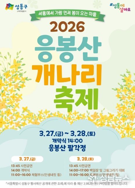 서울 성동구는 오는 3월 27일부터 28일까지 이틀간 봄의 기운을 가득 품은 응봉산에서 ‘2026년 응봉산 개나리 축제’를 개최한다.