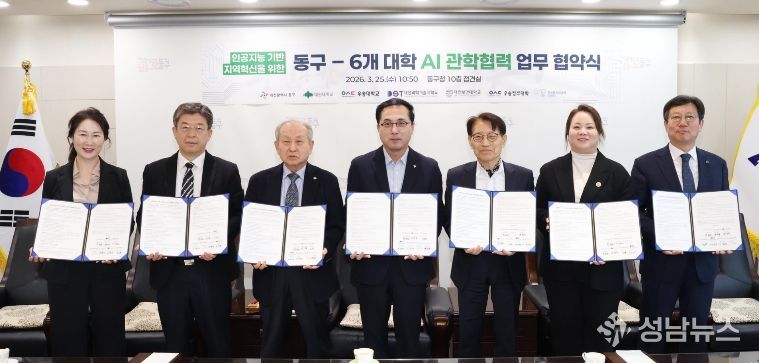 대전 동구는 25일 대전대학교, 우송대학교, 대전과학기술대학교, 대전보건대학교, 우송정보대학, 한국폴리텍Ⅳ대학 대전캠퍼스와 ‘인공지능(AI) 기반 지역혁신을 위한 관학협력 업무협약’을 체결했다고 밝혔다.