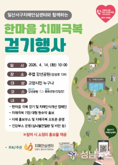 고양특례시 일산서구보건소는 오는 4월 14일 주엽동 강선공원 일원에서 ‘한마음 치매극복 걷기 행사’를 개최한다.