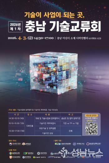 (재)충남테크노파크는 오는 4월 3일 충남 아산시 디바인밸리에서 산·학·연 협력 기반의 기술사업화 촉진을 위한 ‘2026년 제1차 충남 기술교류회’를 개최한다고 밝혔다.