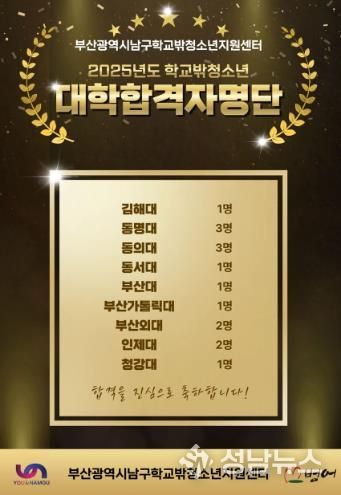 부산 남구 학교밖청소년지원센터는 센터 소속 학교 밖 청소년 15명이 부산대학교, 인제대학교, 동의대학교, 청강대학교 등의 다양한 대학에 합격하는 성과를 거뒀다고 밝혔다.