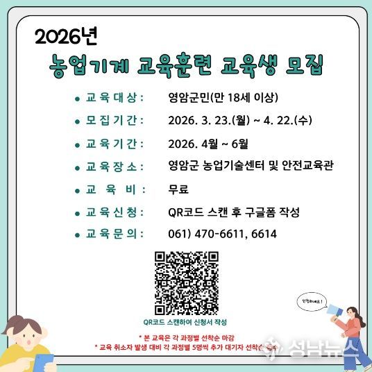 영암군이 농번기를 앞두고 농업기계 안전교육을 강화하며 교육생 모집에 나선다고 밝혔다.