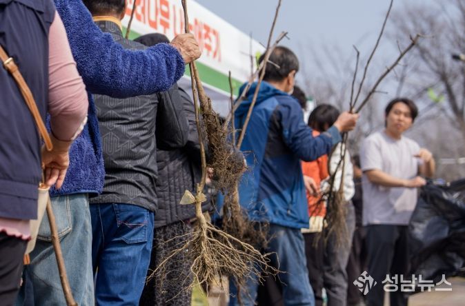 군은 대추나무·감나무·호두나무 등 유실수 묘목 1800본을 준비해 오후 2시부터 1인당 3본씩 선착순으로 배부했다.