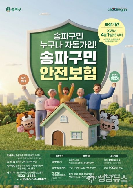 송파구 관계자는 “새롭게 시작하는 구민안전보험이 예기치 못한 사고로 어려움을 겪는 구민에게 도움이 되기를 바란다”며 “앞으로도 구민이 일상에서 안심하고 생활할 수 있도록 촘촘한 사회 안전망 구축에 최선을 다하겠다”라고 전했다.