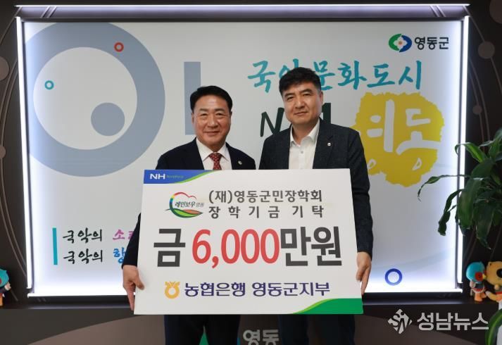 NH농협 영동군지부는 지역 인재 육성을 위한 장학사업 지원을 위해 (재)영동군민장학회에 출연금 6천만 원을 전달했다.
