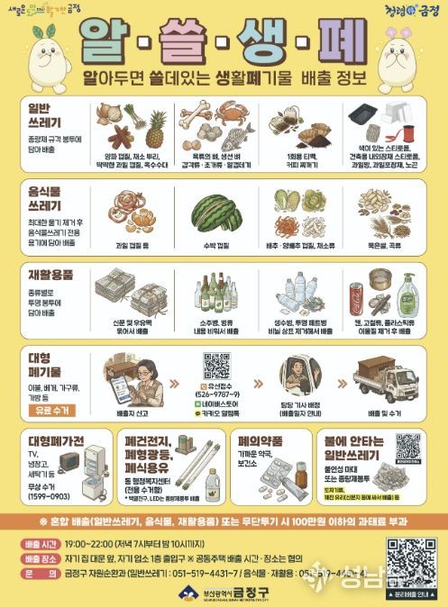 부산 금정구는 생활폐기물 배출에 대한 주민 불편을 해소하고 올바른 분리배출 문화 정착을 위해 ‘알‧쓸‧생‧폐’(알아두면 쓸데 있는 생활폐기물 배출 정보) 홍보지 제작에 나선다고 밝혔다.