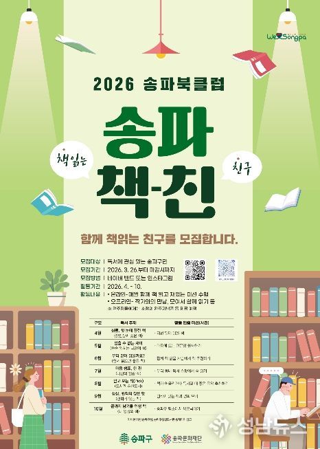 서울 송파구는 독서문화 확산을 위해 4월부터 10월까지 7개월간 ‘2026 송파북클럽-송파 책-친’을 운영한다.