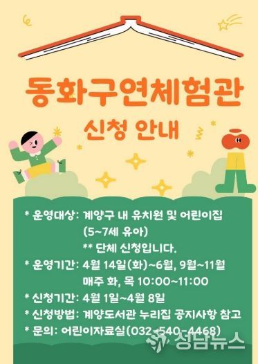 인천광역시교육청계양도서관은 4월 1일부터 계양구 관내 어린이집과 유치원(5~7세)을 대상으로 ‘동화구연 체험관’에 참여할 기관을 모집한다.