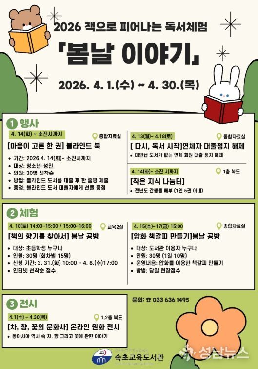 속초교육도서관은 4월 1일부터 30일까지 ‘2026년 책으로 피어나는 독서 체험 '봄날 이야기'’ 행사를 운영한다.