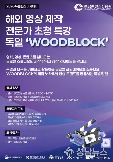 충남콘텐츠진흥원은 오는 4월 2일 순천향대에서 ‘2026 뉴콘텐츠 아카데미’의 일환으로 글로벌 콘텐츠 제작 전문가 초청 특강을 개최한다고 밝혔다.