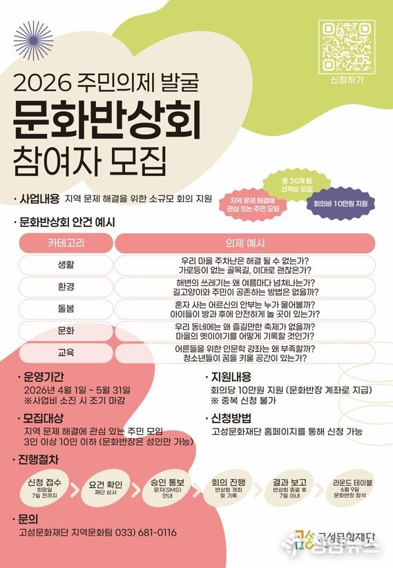 고성문화재단은 주민 스스로 지역의 문제를 진단하고 대안을 모색하는 2026 주민의제 발굴 '문화반상회' 참여 모임을 오는 4월 1일 수요일부터 5월 31일 일요일까지 모집한다.