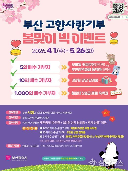 부산시는 2026년 부산에서 개최되는 '제20회 전국장애학생체육대회' 및 '제55회 전국소년체육대회'의 성공적인 개최를 기원하고, 고향사랑기부 참여를 독려하기 위해 '부산 고향사랑기부 봄맞이 빅 이벤트'를 추진한다고 밝혔다.