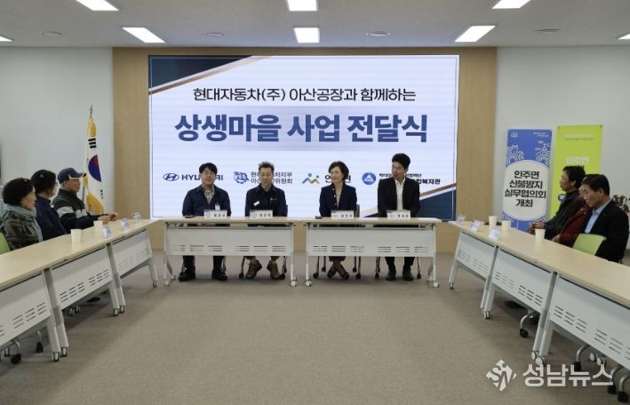 아산시 인주면은 현대자동차(주) 아산공장, 아산시노인종합복지관과 함께 지역 어르신들의 복지 향상을 위한 상생마을사업 전달식을 개최했다.