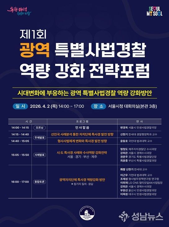 서울시가 2일 오후 2시에 서울시청 대회의실에서'제1회 광역 특별사법경찰 역량 강화 전략포럼'을 개최한다. 관련 연구자와 함께 시‧도 특사경 전담부서장 등이 참석해 해외사례와 현장 노하우 등을 공유하고 광역 특사경 발전방향을 모색한다.