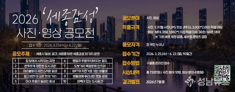 세종시문화관광재단(대표이사 박영국)은 세종시의 도시 일상 감성과 관광 매력을 담은 ‘2026 세종감성 사진영상 공모전’을 개최한다고 밝혔다.