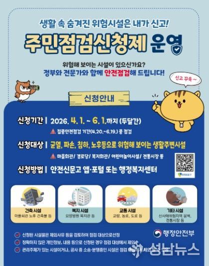 이번 제도는 2026년 집중안전점검 기간(4월 20일~6월 19일)에 맞춰 추진되는 것으로, 점검 대상을 주민들이 직접 선정함으로써 시민들의 안전의식을 높이고, 시설 노후화 등으로 인한 사고를 예방하는 것을 목표로 한다.