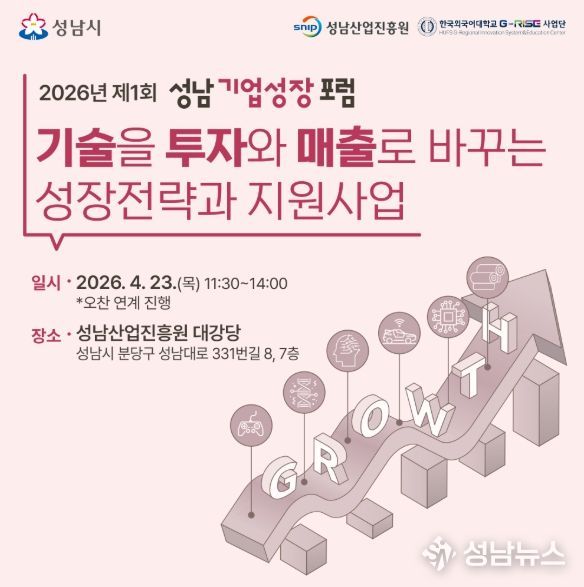 성남산업진흥원은 4월 23일 11시 30분부터 성남산업진흥원 대강당에서 '2026년 제1회 성남기업성장포럼'을 개최한다. 이번 행사는 기술 기반 투자유치와 중동사태 대응 방안을 중심으로 성남 기업의 매출 성장과 글로벌 진출을 모색한다.