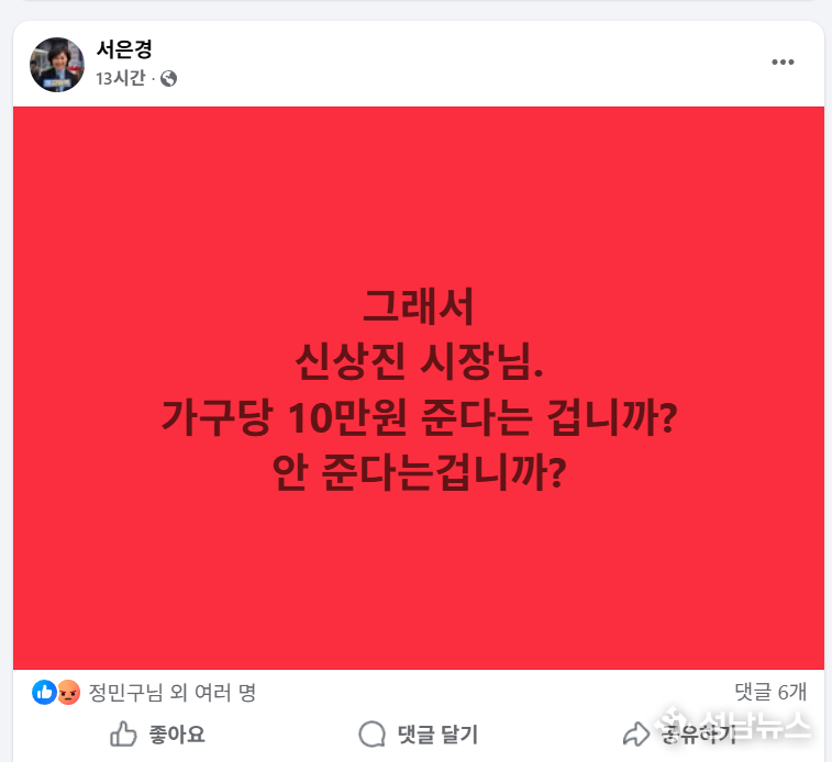 그러나 이 같은 발표에 성남시의회 서은경 의원은 자신의 페이스북에 "그래서 신상진 시장님 가구당 10만원 준다는 겁니까? 안 준다는 겁니까?" 라는 문구를 이미지로 게시하며 정책의 불명확성에 의문을 표했다.