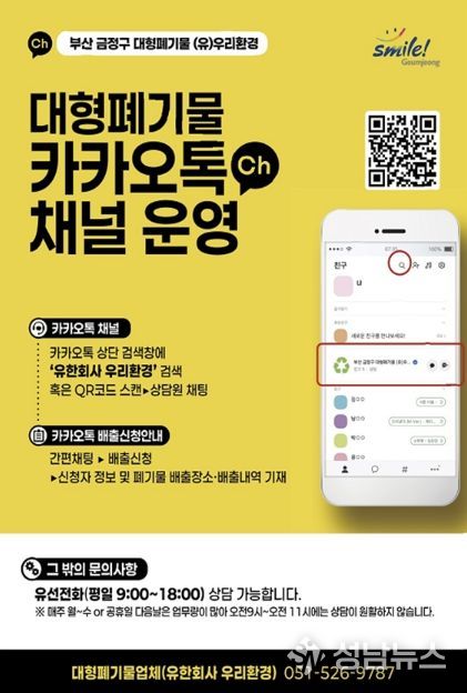 이용 방법은 간단하다. 카카오톡 친구 검색창에서 ‘금정구 대형폐기물’을 검색하거나 안내된 QR코드를 스캔하면 별도의 회원가입 절차 없이 서비스를 이용할 수 있다. 신청자는 배출 품목과 수량 등을 입력한 뒤 수수료를 납부하면 되며, 신고필증을 출력하지 않아도 간편하게 배출할 수 있다.