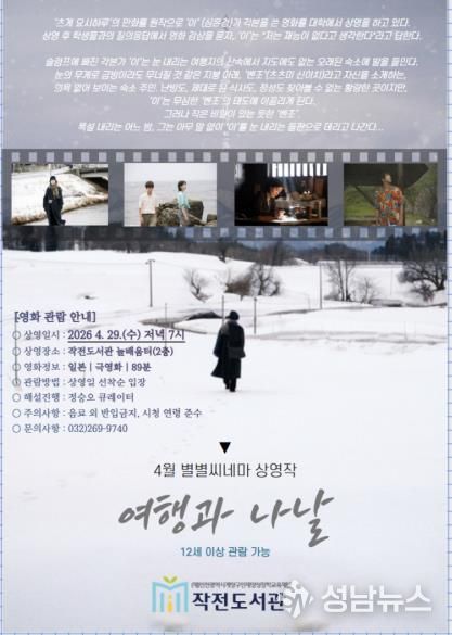 올해 첫 번째 상영은 오는 4월 29일 저녁 7시에 작전도서관 늘배움터(2층)에서 영화 '여행과 나날'을 상영한다.