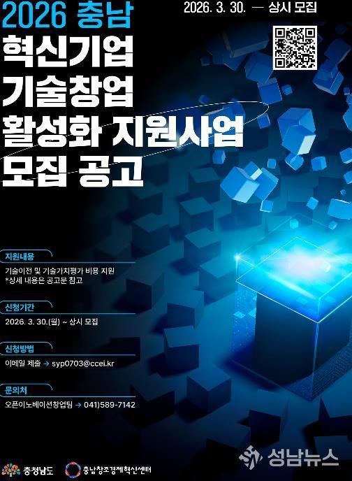 충남창조경제혁신센터가 지역 창업기업의 기술 경쟁력을 높이고 성공적인 사업화를 돕기 위해 ‘2026년 충남 혁신기업 기술창업 활성화 지원사업’을 시행하고 참여 기업을 모집한다고 밝혔다.