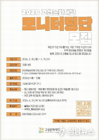 평화 경제 거점 도시 강원 고성군 산하 고성문화재단은 재단이 추진하는 문화예술사업에 대한 군민 의견을 반영하고 사업 환류 체계를 강화하기 위해 ‘2026 고성문화재단 모니터링단’을 모집한다. 이번 사업은 군민 참여 기반의 현장 소통을 확대하고, 문화예술사업 운영의 투명성과 책임성을 높이기 위해 마련됐다.