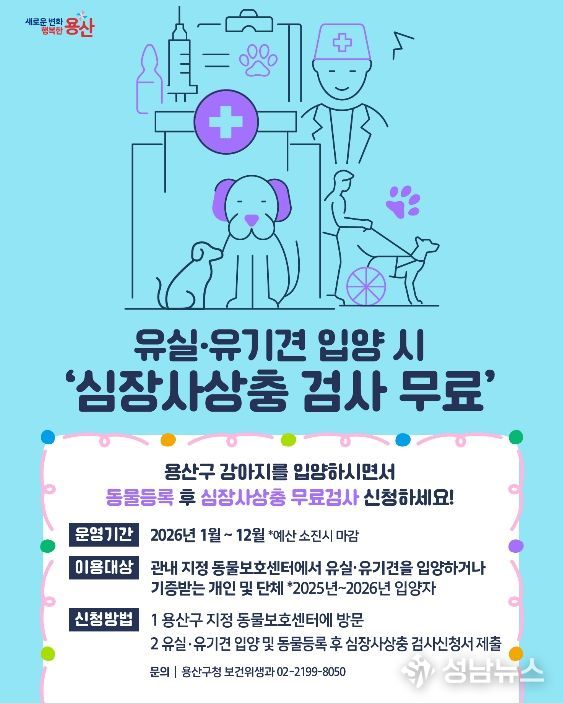 서울 용산구가 유실·유기견 입양 가구를 대상으로 ‘심장사상충 검사비 무료 지원’ 사업을 추진한다. 입양자의 경제적 부담을 덜고 입양을 활성화해, 반려동물 친화도시를 조성하기 위한 취지다.