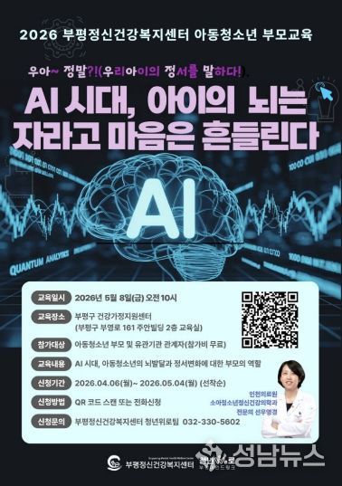 교육은 ▲AI 시대 아동·청소년의 뇌 발달과 정서 변화에 대한 부모의 역할 ▲정신건강 문제에 대한 효과적인 대응 방안 ▲청소년기 뇌 발달과 정신건강의 중요성에 대한 이해 증진 등을 내용으로 진행된다.
