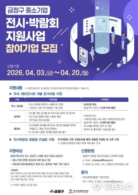 4월 20일까지 신청 가능하며, 자세한 지원 내용과 신청 방법은 금정구청, 부산경제진흥원 홈페이지 공고문을 통해 확인할 수 있다.