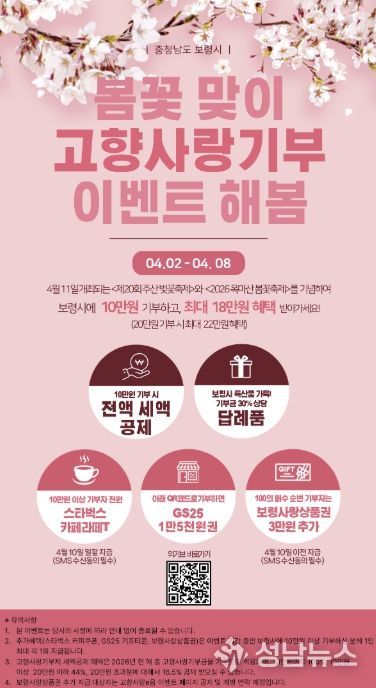 보령시가 제20회 주산 벚꽃축제와 2026 옥마산 봄꽃축제를 맞아 오는 4월 8일까지 ‘봄꽃 맞이 고향사랑기부 이벤트 해봄’을 진행한다.