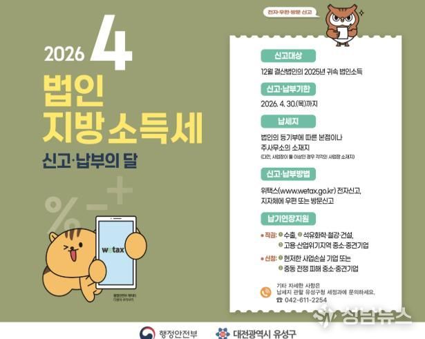 대전 유성구는 오는 30일까지 2025년 귀속 법인지방소득세 신고납부 기간을 운영한다.