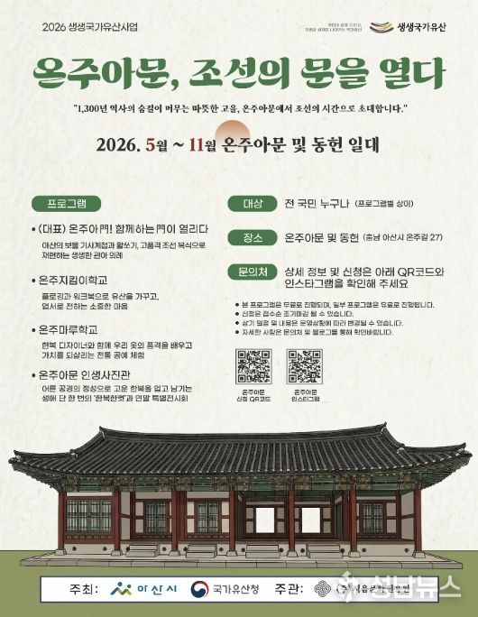 아산시는 ‘2026년 아산 방문의 해’를 맞아 국가유산인 온주아문과 동헌 일원을 활용한 ‘생생 국가유산 사업’을 본격 추진하며 시민들에게 특별한 역사·문화 체험 기회를 제공한다.